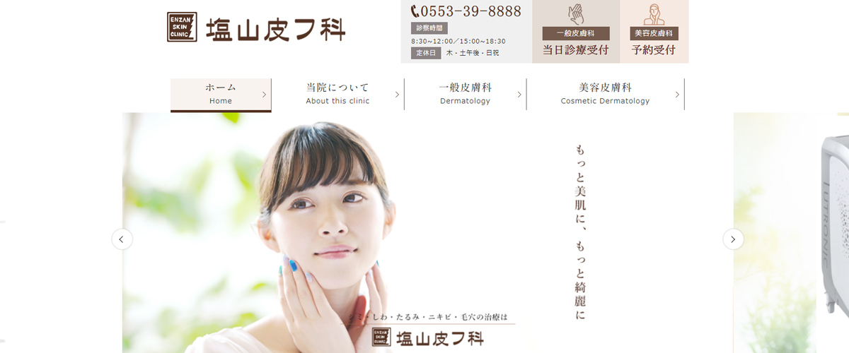 塩山皮フ科は、一般皮膚科はもちろん、美容皮膚科・医療脱毛・AGA(薄毛)治療など、あらゆる疾患・症状の治療に対応できるクリニックです。皮膚のことでお悩みがある方は、ちょっとしたことでもお気軽にご相談ください。